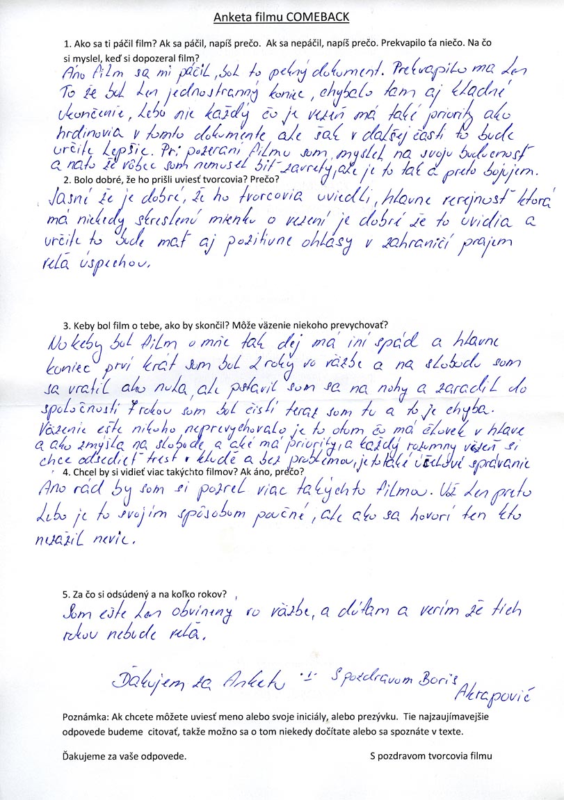 Film Comeback sme chceli pôvodne premierovať v Ilave, v mieste jeho vzniku. Nakoniec sa tak stalo v Karlových Varoch na filmovom festiave. Späť do ilavskej basy sme sa ale vrátili, zvedaví ako naň väzni zareagujú. Eva Rebollo z Asociácie slovenských filmových klubov dostala v tejto súvislosti veľmi dobrý nápad, volala mi a vravela: "Rozdajme v ilavskom väzení po premietnutí Comebacku väzňom anketové listy s piatimi jednoduchými otázkami." Nech sa páči, tuna sú: